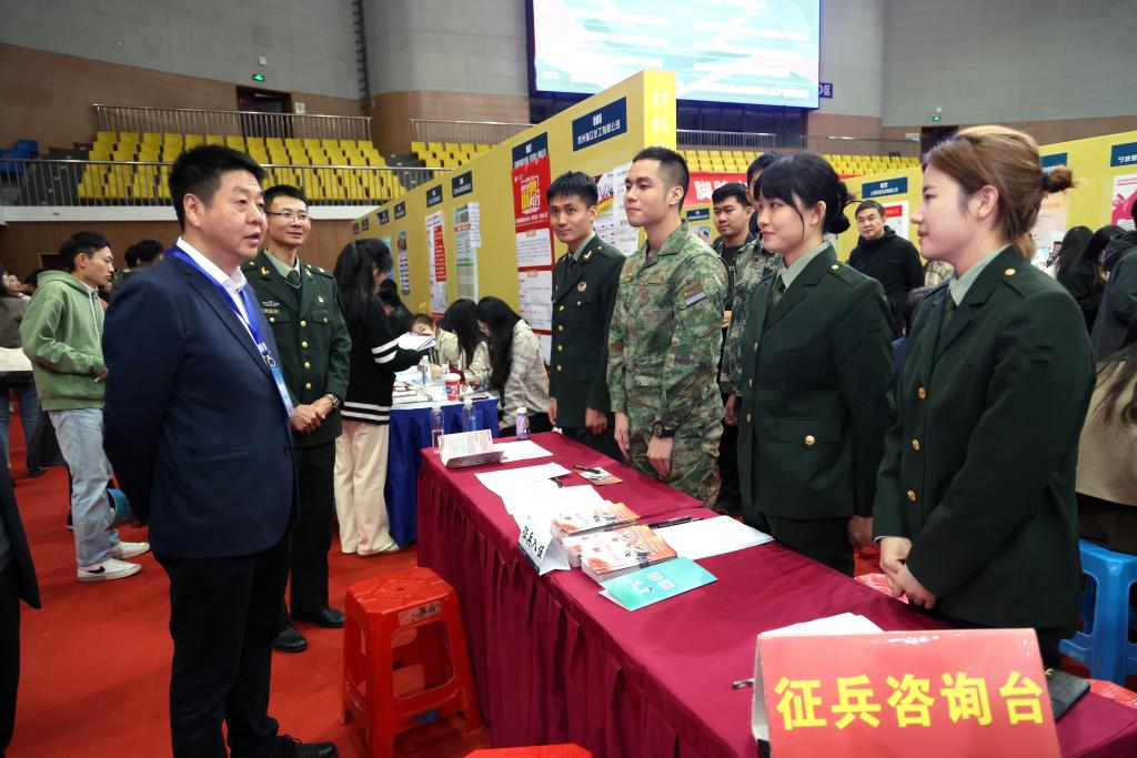 招聘会主入口处特别设置职业生涯、征兵入伍、无锡就业政策咨询专区,将职业规划与就业指导课程延伸至招聘会现场,为毕业生顺利求职精准助力。本次招聘会还设置了“访企拓岗洽谈专区”,各学院安排专人到场与用人单位接洽沟通,开辟就业合作渠道。