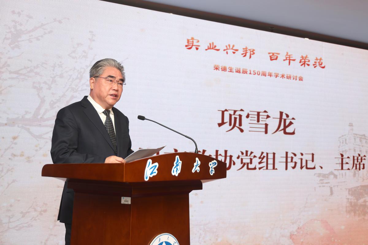 项雪龙在讲话中代表市政协,向荣德生先生致以深切的缅怀和崇高的敬意,并向荣智健先生等荣氏亲属后人长期以来对无锡经济社会发展的支持和贡献表示衷心感谢。他指出,荣德生先生的一生,为无锡近代工商业筑基拓路、不懈奋斗,为国家富强、民族复兴倾情奉献,生动阐释了“敢创人先、坚韧刚毅、崇德厚生、实业报国”的“锡商精神”。他强调,要深入传承、大力弘扬荣德生先生留下的宝贵精神财富,弘扬“敢创人先”开拓精神,充分激发全社会创新活力;秉持“坚韧刚毅”奋斗意志,奋力开创我市改革发展新局面;根植“崇德厚生”为民情怀,努力创造更高品质幸福生活;践行“实业报国”责任担当,持续推动产业发展逐高向新。